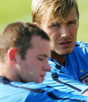 England soccer captain David Beckham (R) talks with Wayne Rooney during training near London ahead of the World Cup qualifier against Wales, August 31, 2005. England are due to face Wales at the Millennium Stadium in Cardiff on September 3. [Reuters]