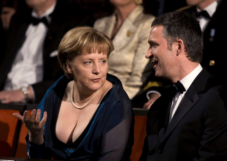 中國日報網(wǎng)站環(huán)球在線消息:在挪威訪問時,德國總理默克爾4月12日晚身著低胸裝,出席了挪威歌劇院啟用典禮,被英國《每日郵報》稱之為“大規(guī)模分神武器”。