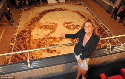 這個(gè)新的拼圖總共用了9852個(gè)烤面包片,寬約10米,長(zhǎng)約12.8米,是27歲的勞拉送給婆婆惠特菲爾德女士50歲生日的特別禮物。勞拉通過(guò)社交網(wǎng)站臉譜(Facebook)找來(lái)40個(gè)朋友做志愿者,用9個(gè)烤面包機(jī)把面包烤成各種不同的程度,然后根據(jù)它們的顏色深淺花了6個(gè)小時(shí)拼成婆婆的頭像。