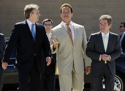 7月31日,布萊爾(左)與施瓦辛格(中)在加州會面。
