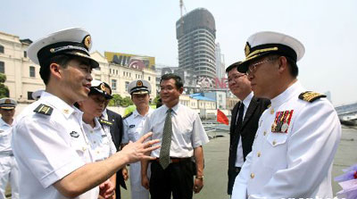 圖為中國(guó)海軍上?;馗眳⒅\長(zhǎng)汪立平上校(左),與“吉打”號(hào)巡邏艦艦長(zhǎng)陳朋榮海軍中校(右)交談。