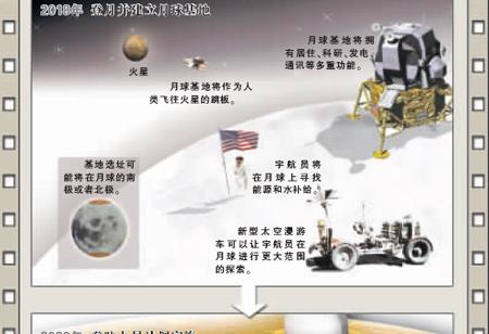 阿波羅探月計(jì)劃結(jié)束30多年后,美國總統(tǒng)布什在2004年初提出了“太空探索遠(yuǎn)景計(jì)劃”(Vision forSpaceExploration)———2018年,人類將再次登上月球,并建立月球基地;從2020年開始著手為人類登上火星做準(zhǔn)備。今年8月,美國宇航局將正式公布一份以此為基礎(chǔ)的太空探索計(jì)劃,詳細(xì)描繪出人類重上月球的具體方案。