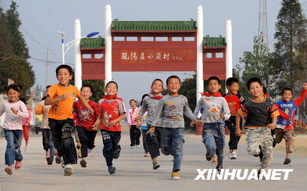 這是小崗村小學(xué)的孩子們奔跑在村中大路上(10月7日攝)。新華社記者 陶明 攝