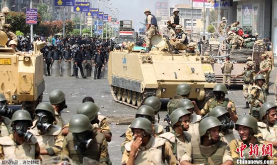 埃及安全部隊(duì)在當(dāng)?shù)貢r(shí)間8月14日對(duì)兩處抗議者營(yíng)地進(jìn)行“清場(chǎng)”行動(dòng),終止前總統(tǒng)穆?tīng)栁髦С终叩撵o坐示威。清場(chǎng)行動(dòng)開(kāi)始后雙方爆發(fā)激烈沖突造成嚴(yán)重傷亡。埃及總統(tǒng)府于當(dāng)日宣布全國(guó)進(jìn)入為期一個(gè)月的緊急狀態(tài),在每日19時(shí)至次日6時(shí)實(shí)行宵禁。圖為防爆警察和軍方人員出動(dòng)裝甲車(chē)。