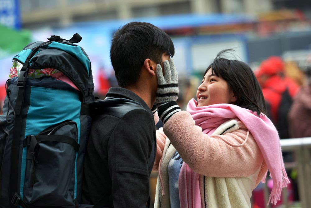 4、 2016年1月24日,在貴州省貴陽(yáng)火車站,一對(duì)情侶依依不舍地告別。 秦剛/中國(guó)日?qǐng)?bào)亞洲新聞圖片網(wǎng)