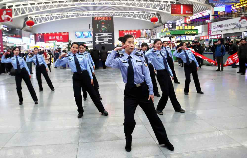 5、 2016年1月24日,遼寧省沈陽鐵路警方舉行了春運(yùn)首日安全宣傳活動,民警跳起了自編的“快閃”舞。 黃金崑/中國日報(bào)亞洲新聞圖片網(wǎng)