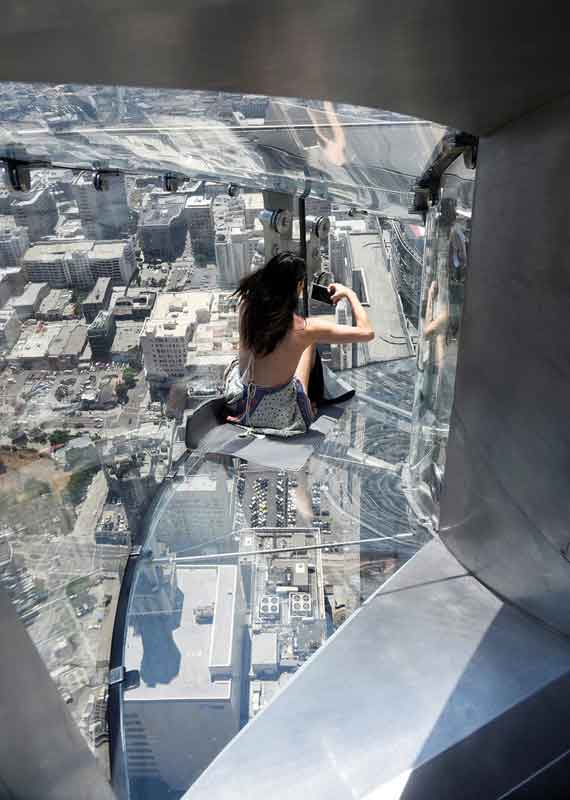 洛杉磯的聯(lián)邦銀行大樓離地約一千英尺,一側(cè)裝有一個45英尺長,1.25英寸厚的透明玻璃滑梯,乘客可以從第七十層滑到第六十九層。旁邊還有一個360度觀景臺,稱為空中觀景平臺(skyspace),給游客更多的時間來享受美景或發(fā)覺自己的恐高癥。