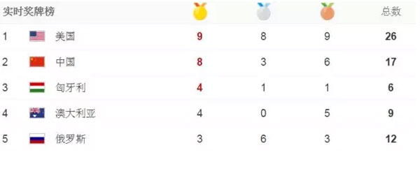 截止今日上午11時,中國以8金3銀6銅位居獎牌榜第二位。