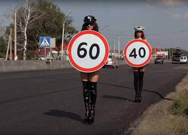 A road safety campaign in Russia has come up with an inventive way to force drivers to slow down - by using topless women to carry speed limit signs.