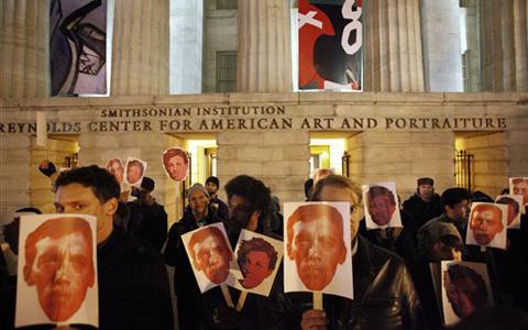 People demonstrated in front of the National Portrait Gallery, holding pictures of the artist, David Wojnarowicz. One protestor said that removing the video was an attack on the American people. He said lawmakers were saying Americans are not smart enough to make their own decisions about what art to see.