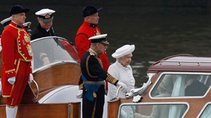 女王和王室成員已經(jīng)在特制的皇家劃艇之中就座,在由英國奧林匹克劃船比賽金牌得主等掌舵的皇家劃艇帶領(lǐng)下,女王皇家游船等一千多艘大小船只同時(shí)從Battersea橋出發(fā),以每小時(shí)4節(jié)的平緩的速度,穿過泰晤士河倫敦市中心段的11座橋,把當(dāng)日的盛典慶?;顒?dòng)推向高潮。