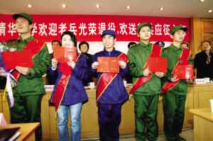 各個(gè)高校制定了很多特殊政策鼓勵(lì)學(xué)生參軍。如清華將資助退役學(xué)生的獎(jiǎng)金從每年3000元提高到5000元。學(xué)生入伍不能完成本學(xué)期課程考核的,學(xué)校會(huì)開綠燈提前結(jié)束他們的課程。在服役期間榮立三等功以上或連續(xù)兩年被評(píng)為“優(yōu)秀士兵”的學(xué)生,成績(jī)達(dá)到免試研究生基本條件的優(yōu)先推薦。今年清華共有5名學(xué)生入伍,北大有3人。