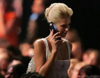Socialite, actress and model Paris Hilton talks on her cell phone at the Shrine Auditorium in Los Angeles November 22, 2005.