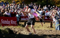 第七屆北美年度背老婆錦標賽于上周六在星期日河地區(qū)舉行,來自加里本(美國緬因州北部)的前冬奧會冠軍約翰·法拉獲得比賽冠軍,他賽前的訓(xùn)練是背80磅重的混凝土包跑上一個滑雪坡。