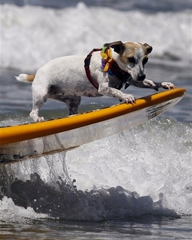 'Zoey' balances on the nose of his owner's board during their heat in the tandem division at the 2nd Annual Loews Coronado Bay Resort Surf Dog Competition held in Imperial Beach, Calif., Saturday, Aug. 18, 2007. The annual charity event had over 40 entries and featured two divisions for surfing dogs and their owners. (AP)