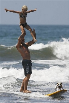 Scott Chandler hoists his daughter Tyler Chandler, 8, up onto his shoulders as his dog Zoey balances on the nose of the board during their heat in the tandem division at the 2nd Annual Loews Coronado Bay Resort Surf Dog Competition held in Imperial Beach, Calif., Saturday, Aug. 18, 2007. The annual charity event had over 40 entries and featured two divisions for surfing dogs and their owners. (AP)