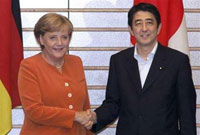 German Chancellor Angela Merkel (L) shakes hands with Japanese Prime Minister Shinzo Abe at his official residence in Tokyo August 29, 2007.