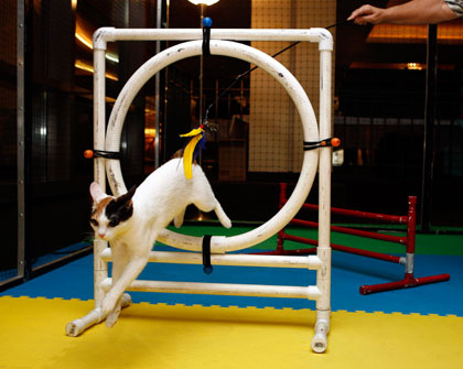 Tess, a Japanese Bobtail cat, jumps through a hoop during a media preview for The Cat Fanciers' Association 5th Annual CFA-Iams Cat Championship in New York October 10, 2007. (Reuters)