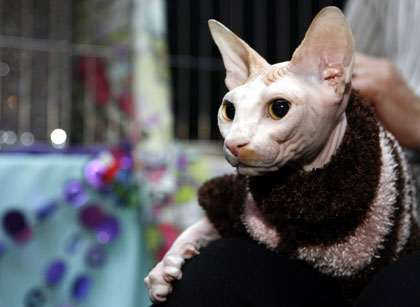 Billy Idol, a Sphynx cat, sits with his owner during a media preview for The Cat Fanciers' Association 5th Annual CFA-Iams Cat Championship in New York October 10, 2007. (Reuters)