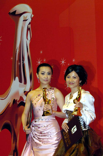 Hong Kong actress Carina Lau and Chinese mainland  actress Yan Bingyan win the award for the Best Actress at the 26th Golden Rooster Film Festival in Suzhou, China's Jiangsu Province October 27, 2007. (Xinhua)