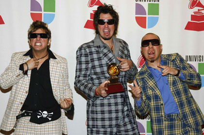 Members of the Panamanian group Rabanes hold the Grammy for best rock album by a duo or group with vocal for "Kamikaze" at the 8th annual Latin Grammy Awards in Las Vegas November 8, 2007. (Agencies)