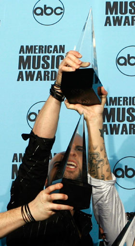 Chris Daughtry and band members celebrate with their awards backstage in the photo room at the 2007 American Music Awards in Los Angeles, California November 18, 2007. (Agencies)