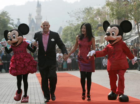 People dressed as cartoon characters Mickey and Minnie, Executive Vice President and Managing Director of Hong Kong Disneyland Bill Ernest (2nd L) and Hong Kong designer Vivienne Tam (2nd R) greet visitors at Hong Kong Disneyland January 21, 2008. The new costumes of Mickey and Minnie, along with other activities, form the "Year of the Mouse Celebration" held by the entertainment theme park for the upcoming Lunar Year of the Rat. (Agencies)