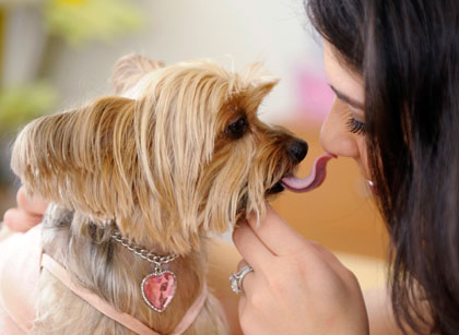 Co-founder of Little Lily Lara Alameddine dresses Lily in Los Angeles, California February 18, 2008. Pet fashion label Little Lily has designed a range of dog clothes inspired by the actual gowns worn by A-listers on the Oscar red carpet.
