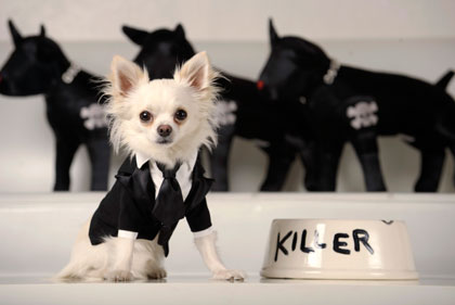 Rocco poses in the Leo tux, inspired by one worn by actor Leonardo DiCaprio to the Oscars, at Little Lily in Los Angeles, California February 18, 2008. Pet fashion label Little Lily has designed a range of dog clothes inspired by the actual gowns worn by A-listers on the Oscar red carpet. (Agencies)