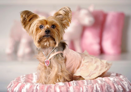 Lily models the Penelope gown, inspired by the gown worn by Penelope Cruz to the Oscars in 2007, at Little Lily in Los Angeles, California February 18, 2008. Pet fashion label Little Lily has designed a range of dog clothes inspired by the actual gowns worn by A-listers on the Oscar red carpet.(Agencies)