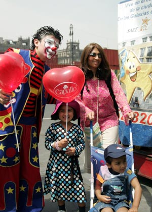 A man dressed up as a clown poses for pictures with a mother and her kids near a subway station in Mexico City, Mexico, on May 10, 2008. Many young people would like to bring flowers and gifts for their mothers and accompany them on the Mother's Day as a way of celebration. (Xinhua)