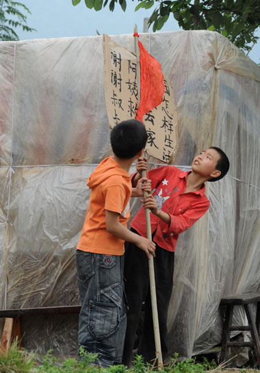 Two boys adjust a wooden pole with a banner reading "Thank you for saving me" outside their shelter in Mianzhu city of Sichuan May 16, 2008. China has mobilized 130,000 troops by Thursday to the disaster area and the first foreign rescue teams, from Japan, Russia, South Korea and Singapore and China's Taiwan have arrived.