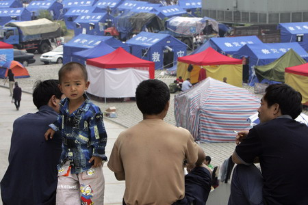 An earthquake survivor stands near his father on the top of a staircase in the coliseum housing homeless people in Mianyang, Sichuan province, May 20, 2008. The death toll from last week's quake rose to 40,075 nationwide as of 6 pm on Tuesday, with 247,645 injured. (Agencies)