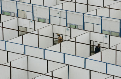 Workers look into temporary housing being built for residents affected by an earthquake in Dujiangyan, west of Chengdu, Sichuan Province May 22, 2008. Millions of people became homeless after a massive earthquake hit the province on May 12. (Agencies)