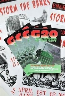G20 protest flyers advertising the website of an organisation that plans protests against the upcoming G20 meeting in London.