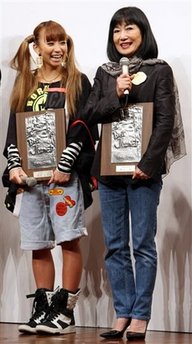 Miyuki Hatoyama, right, wife of Japanese Prime Minister Yuko Hatoyama, speaks after being awarded the Japan Jeans Association prize during an awarding ceremony of the 26th Best Jeanist Awards in Tokyo, Japan, Monday, Oct. 19, 2009. |