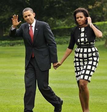 The Obamas are hand in hand.