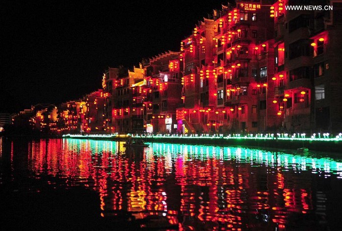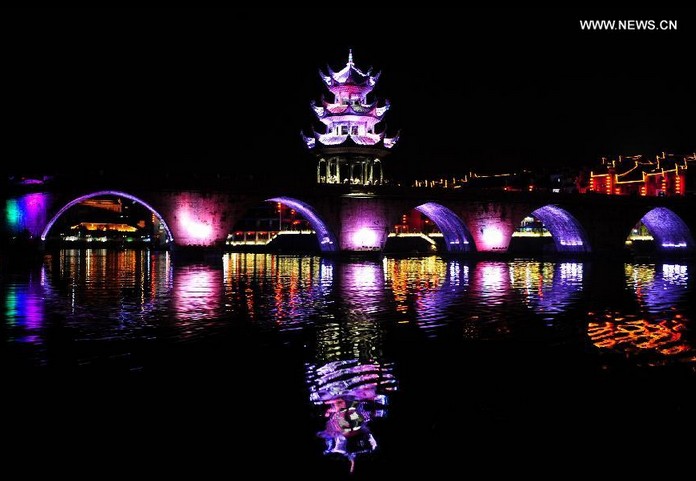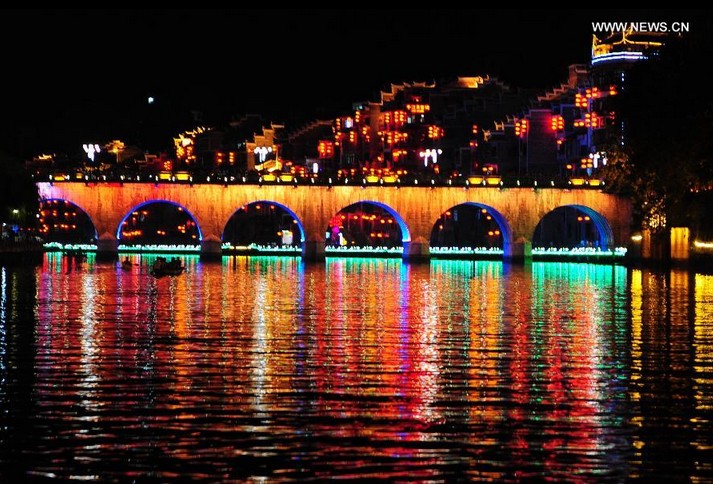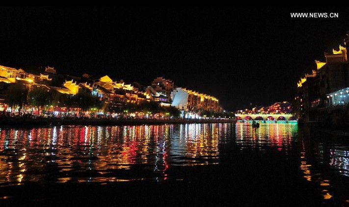 Photo taken on Aug. 5, 2013 shows a night scenery of Zhenyuan Ancient Town in southwest China's Guizhou Province. Known as "Oriental Venice", Zhenyuan Ancient Town witnessed a tourism peak this summer. (Xinhua/Liu Xu)