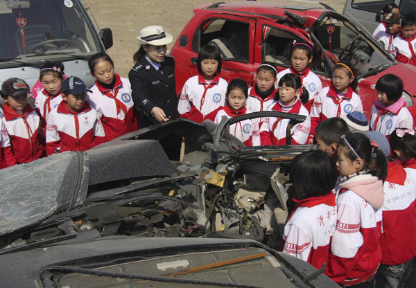 ![Students examine a destroyed vehicle under the guidance of a traffic policewoman at a primary school in Yinan county, East China’s Shandong province, March 28, 2011. [Photo/Xinhua] Students nationwide study security, safety](../../images/attachement/jpg/site1/20110330/0023ae80a2120efd1fc43a.jpg) |