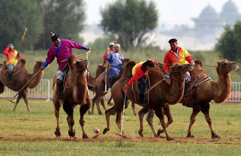 Athletes from North China's Inner Mongolia autonomous region perform camel ball during the 10th National Traditional Games of Ethnic Minorities of China in Ordos, North China's Inner Mongolia autonomous region, Aug 11, 2015.