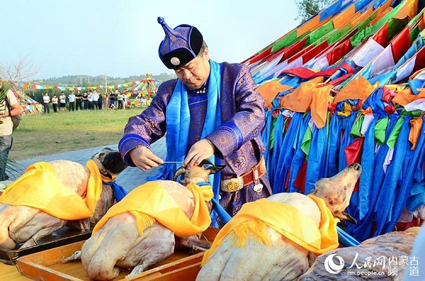 Hundreds of herdsmen circled around a cone-shaped mound called Aobao to offer livestock and libation on July 6, praying to the spirits for peace and a good harvest.