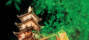The Fahua Pagoda, 40.8 meters tall, is a square, brick-wood structure with seven stories, accessible by ladders.