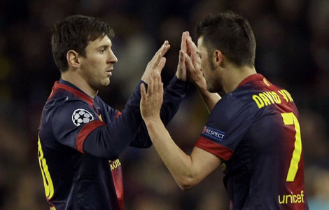 Paris St Germain's Thiago Silva (L) challenges Barcelona's Lionnel Messi during their Champions League quarterfinal first leg soccer match at the Parc des Princes Stadium in Paris, April 2, 2013. [Photo/Agencies] |