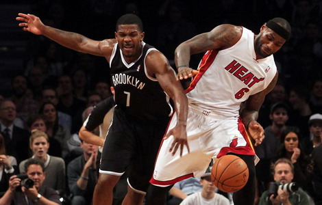 Brooklyn Nets shooting guard Joe Johnson (7) and Miami Heat small forward LeBron James (6) fight for the ball during the first quarter of a game at Barclays Center. [Photo/Agencies] |