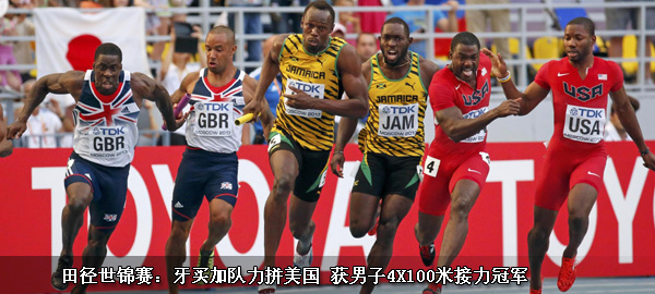 8月18日,牙買加隊(duì)最后一棒選手博爾特(中)沖過終點(diǎn)。當(dāng)日,在俄羅斯莫斯科舉行的2013年國際田聯(lián)世界田徑錦標(biāo)賽男子4X100米接力決賽中,牙買加隊(duì)以37秒36的成績(jī)奪得冠軍。當(dāng)日,在俄羅斯莫斯科舉行的2013年國際田聯(lián)世界田徑錦標(biāo)賽男子4X100米接力決賽中,牙買加隊(duì)以37秒36的成績(jī)奪得冠軍。