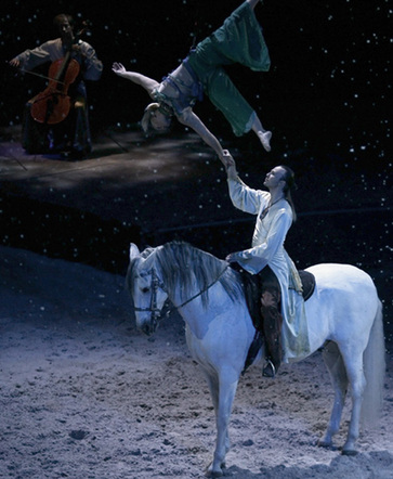 A rider performs with a woman suspended by a bungee cord during the equestrian show "Cavalia" in Lisbon October 5, 2008. "Cavalia" was created by Normand Latourelle, one of the founders of Cirque du Soleil. [Agencies]